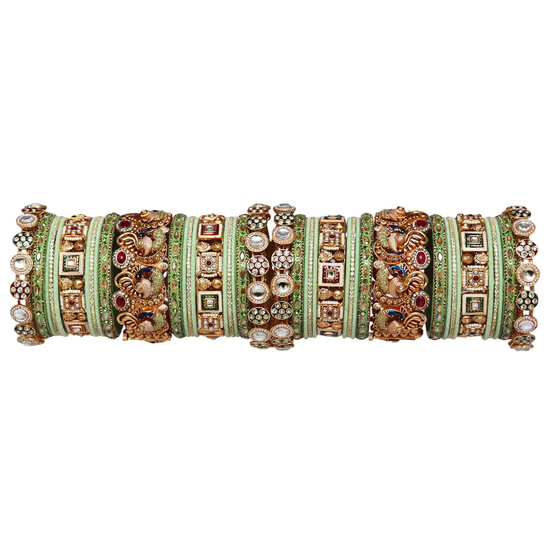 Surrounding the central kada are kundan stones design metal bangadi bangles placed on both sides, offering rich sparkle and refined detailing. These are complemented by kundan-rhinestones design Sea Green lac bangles, which add brilliance without overpowering the traditional look. Sea green velvet-finished metal bangles enhance the softness and richness of the set, making it a stunning kundan bridal chura suitable for grand occasions.