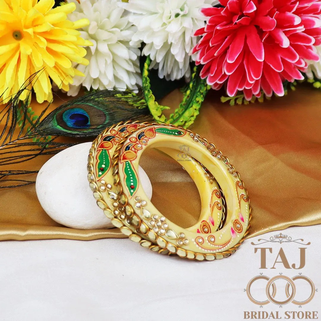 Experience the beauty and tradition of Rajputi Rajwadi bangles with this exquisite set, and let the intricate peacock design and dazzling kundan work bring a piece of royal heritage to your wardrobe.